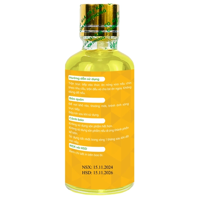 Cho ~5ml dầu ăn dặm theo nhu cầu vào thức ăn nóng, vừa nấu chín, trộn đều vào cho bé ăn ngay.